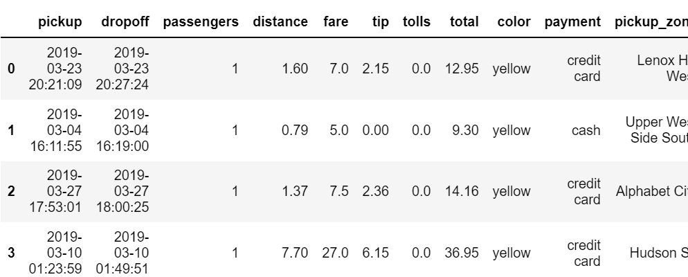 import seaborn as sns df = sns.load_dataset('taxis') print(df) print(df.info())