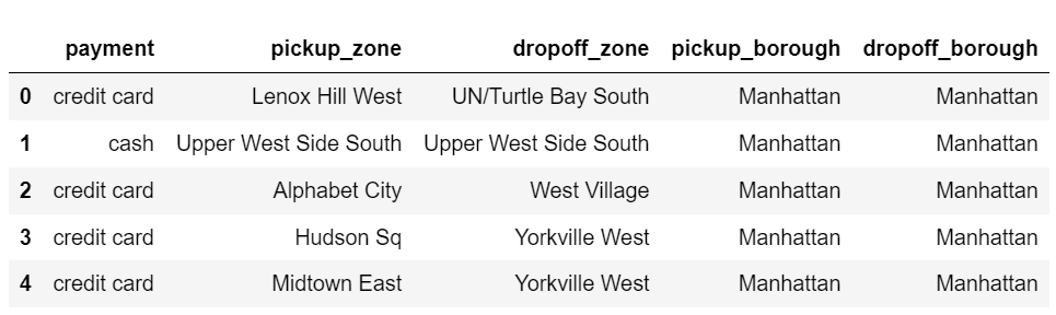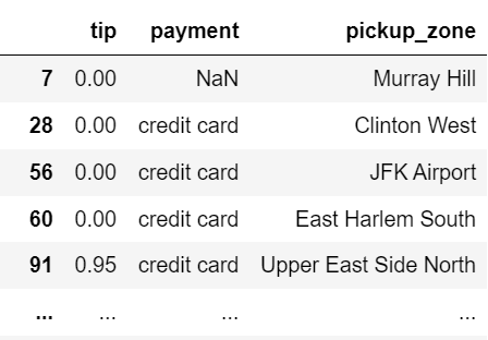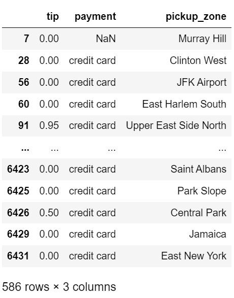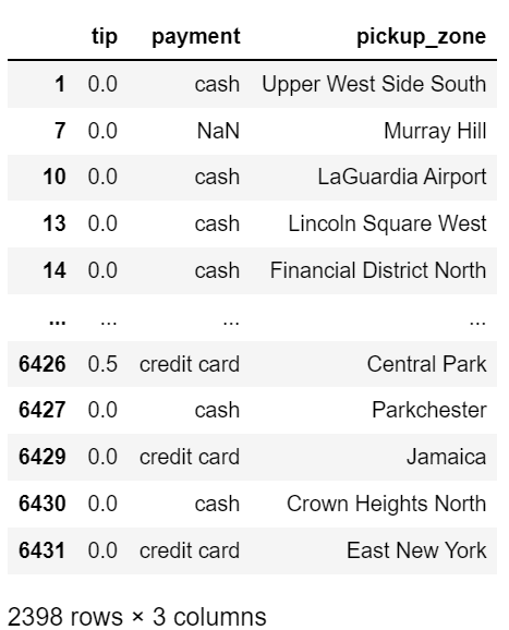 condition = (df.tip < 1) & ~(df.payment=='cash') df.loc[condition, ['tip','payment','pickup_zone']]