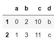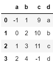 ex1_df = pd.DataFrame({ 'a':[-1,0,1,2], 'b':[1,2,3,4], 'c':[9,10,11,-1], 'd':['a','b','c','d'] })