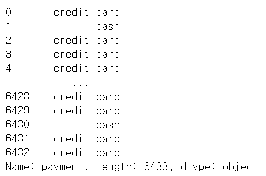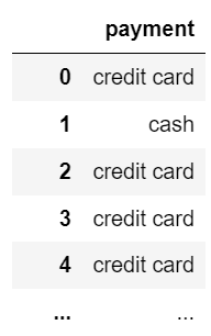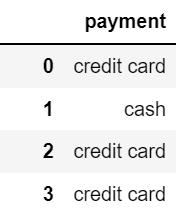 # .isin([조건리스트]) : 조건리스트 안의 값중 하나와 동일하면 True 반환 df.loc[df.payment.isin(['cash','credit card']),['payment']]