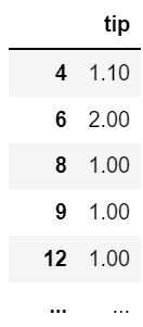 따라서 df.loc[df.tip < 1, : ]는 df.tip < 1 조건을 만족하는 행(True)에 대해서 반환한다.