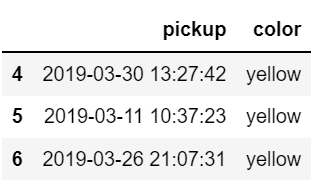 import pandas as pd# 행 : 인덱스 4~6번 # 열 : pickup, color 컬럼 df.loc[4:6, ['pickup','color']]