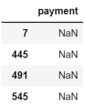 # .isnull() : Null값을 가지면 True 반환 df.loc[df.payment.isnull(),['payment']]