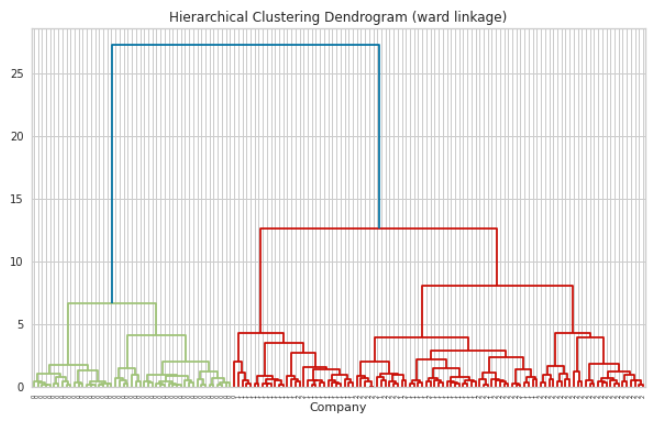 from scipy.cluster.hierarchy import dendrogram, linkage Z = linkage(df, method="ward") fig = plt.figure(figsize=(10, 6)) dendrogram(Z, labels=y) plt.title('Hierarchical Clustering Dendrogram (ward linkage)') plt.xlabel('Company') plt.show()