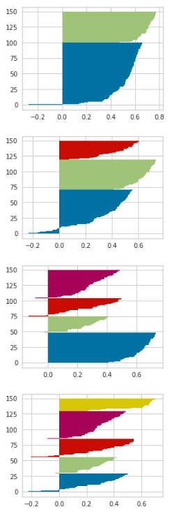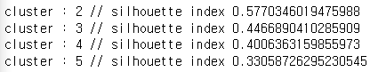 for k in range(2, 6): agg = AgglomerativeClustering(n_clusters=k).fit(df) silhouette_avg = silhouette_score(df, agg.labels_) print(f'cluster : {k} // silhouette index {silhouette_avg}')