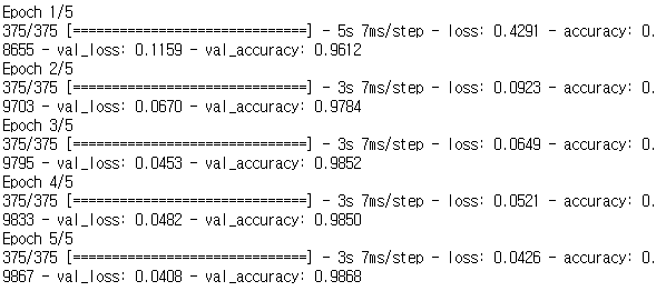 history = cnn.fit(x_train, y_train, epochs=5, # 반복학습 횟수 batch_size=128, # 1epoch에 모든 데이터를 한번에 돌리는게 아닌, batch로 나누어 돌림 validation_data=(x_test, y_test)) # 검증셋