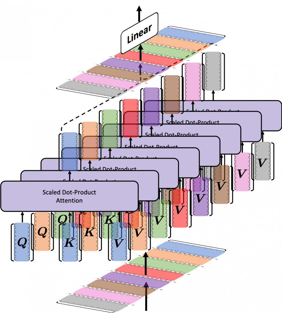 앞서 설명한 Self Attention은 임의의 숫자만큼 생성되며, 모든 Self Attention 결과를 이어붙인 후 \(W_{O}\)와 행렬곱하여 최종 Attention을 도출한다.
