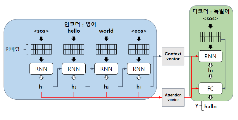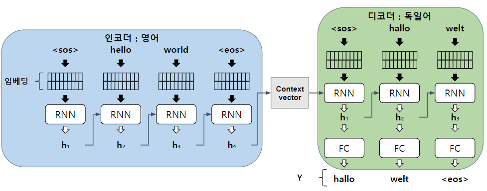 문장을 차례로 예측하기 때문에 Decoder는 처음에 <sos>만을 입력으로 받고 최종 출력으로 <eos>가 나올때까지 반복된다.
