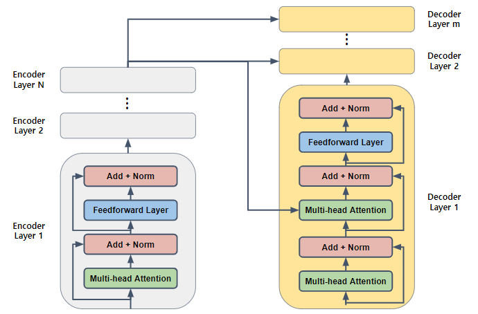 이때 Encoder Layer는 사용자가 임의로 n개를 쌓아 구성하며, n 번째의 Encoder Layer의 출력값은 모든 Decoder Layer에 입력된다.