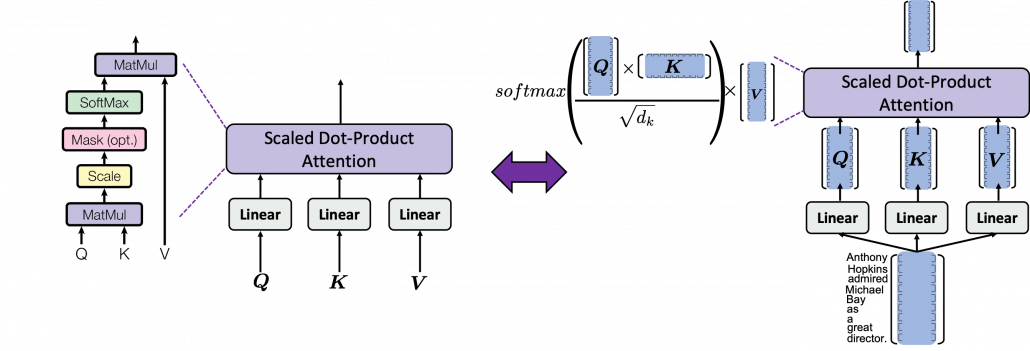 $$ Attention(Q,K,V) = softmax(\frac{QK^{T}}{\sqrt{d_{K}}})V $$