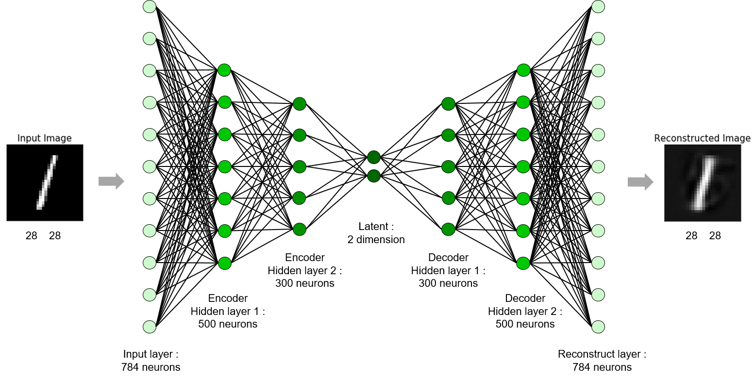 Encoder에서는 세번에 걸쳐서 데이터의 차원을 압축한다. (784 =>500, 500=>300, 300=>2)