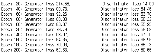 # Training for epoch in range(1, n_epochs + 1): total_loss_g, total_loss_d = 0, 0 # 직접 배치별로 trin_step을 수행해서 loss를 받아옴 for x in train_data: loss_g, loss_d = train_step(x) total_loss_g += loss_g total_loss_d += loss_d # 학습성능 출력간격별로 출력 if epoch % log_interval == 0: print(f'Epoch {epoch:3d}: Generator loss {total_loss_g:.2f}, \ Discriminator loss {total_loss_d:.2f}')