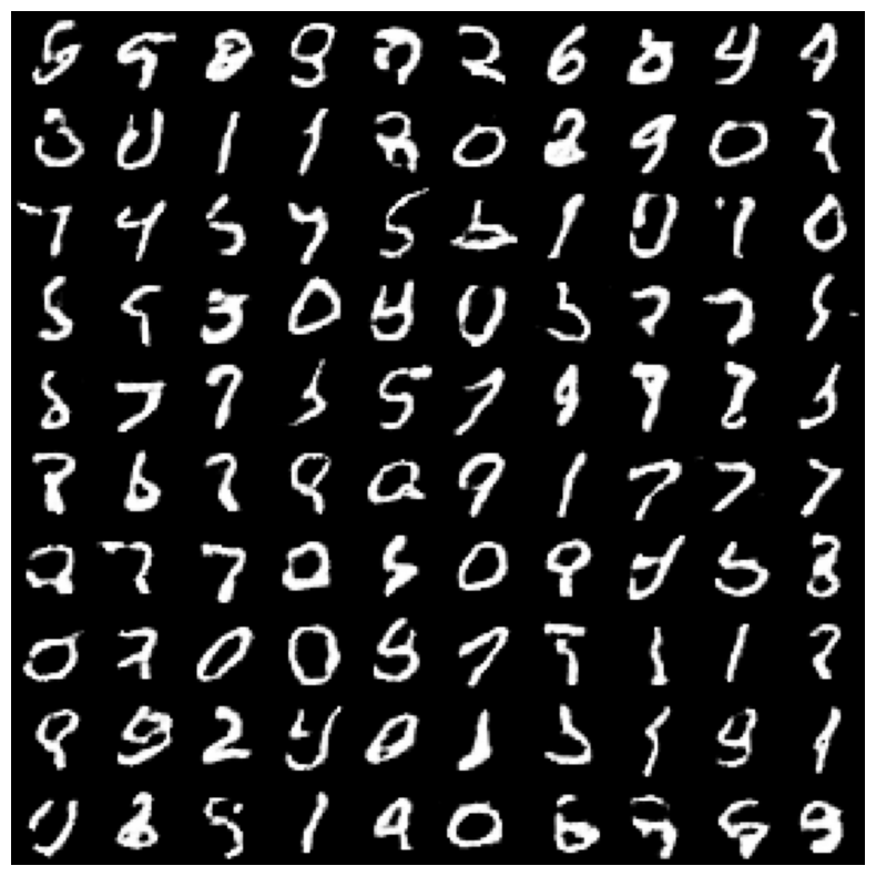 # Generator로부터 Image Sampling def plot_latent_images(n, digit_size=28): noises = tf.random.normal([n, n, latent_dim]) image_width = digit_size * n image_height = image_width image = np.zeros((image_height, image_width)) for i in range(n): for j in range(n): z = tf.random.normal([1, latent_dim]) g_z = generator(z) image[i * digit_size : (i+1)*digit_size, j * digit_size : (j+1) * digit_size] = g_z[0, :, :, 0] plt.figure(figsize=(10,10)) plt.imshow(image, cmap='Greys_r') plt.axis('Off') plt.show()