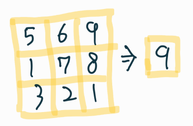 아래 그림에서는 숫자 7을 중심으로 3*3 필터를 사용하여서 가장 큰 값 9로 대체한다.