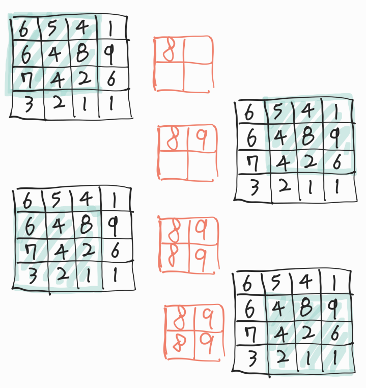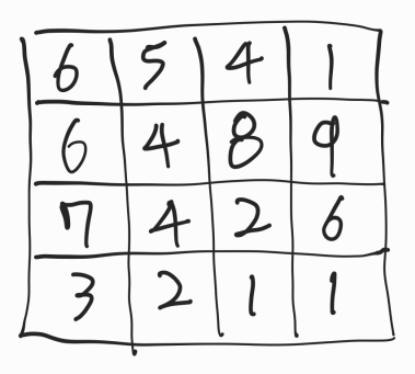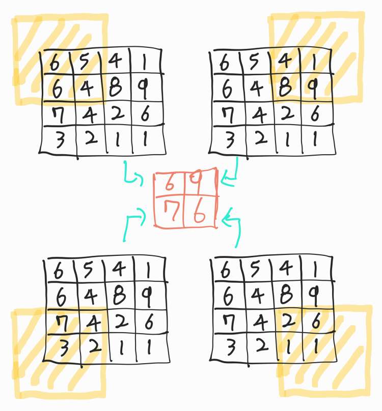 import tensorflow as tf from tensorflow.keras.layers import MaxPool2D input_image = tf.constant([[[[6.], [5.], [4.], [1.]], [[6.], [4.], [8.], [9.]], [[7.], [4.], [2.], [6.]], [[3.], [2.], [1.], [1.]]]])아래의 그림과 동일한 임시 이미지를 생성한다.