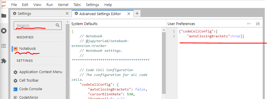 Notebook의 User Preferences에 "codeCellConfig":{"autoClosingBrackets":true} 구문을 추가해주면 된다.