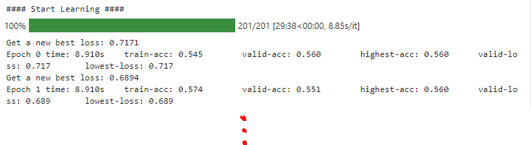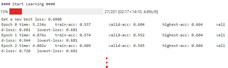 import time import os from tqdm.auto import trange def train_all_in_one(train_dataset, valid_dataset): # 모델 선언 및 디바이스 지정(gpu) # Pytorch는 모델이 사용할 디바이스를 지정해줘야한다. model = CatDogModel().to(device) # 최적화 함수 및 손실함수 지정 optimizer = torch.optim.Adam(model.parameters(), lr=0.001) loss_fn = torch.nn.CrossEntropyLoss() # Train/valid 데이터 DataLoader에 넣기 # DataLoader는 학습 및 평가시에 batch 단위로 데이터를 준비해주는 기능 # num_workers : 병렬작업할 쓰레드 개수 train_loader = torch.utils.data.DataLoader( train_dataset, batch_size=32, shuffle=True, num_workers=16) valid_loader = torch.utils.data.DataLoader( valid_dataset, batch_size=32, shuffle=False, num_workers=16) # early_stop기법 구현을 위한 변수 # early stop : validation set에 대한 성능향상이 이루어지지 않으면 학습을 중단하는 기법 early_stop_max_round = 20 # validation set에 대한 성능이 개선되기까지의 dead line # 최고성능 갱신 후 20 epoch안에 다시 최고성능 갱신을 해야한다 early_stop_now_round = early_stop_max_round # 성능 갱신까지 남은 기회 # 성능 출력을 위한 함수 highest_accuracy = 0.0 # 최고 정확도 lowest_loss = 1000.0 # 최저 loss print("#### Start Learning ####") # 반복학습 구간 # trange(201)은 range(201)과 같은나, 진행상황을 하단에 게이지바로 보여줌 for epoch in trange(201): start_time = time.time() # epoch 시작시간 저장 ##### Train part ##### model.train() # 모델을 train 모드로 설정 train_correct = 0 # epoch에서 맞춘 데이터 개수 train_total = 0 # epoch에서 사용된 데이터 개수 for batch in train_loader: # 데이터로더에서 batch별로 받아오기 images, labels = batch # X, Y로 나누어 받기 images = images.to(device) # 처리할 디바이스 지정 labels = labels.to(device) # 처리할 디바이스 지정 optimizer.zero_grad() # 최적화함수 초기화 predictions = model(images) # batch별로 예측하기 train_loss = loss_fn(predictions, labels) # 예측결과로 loss 계산 train_loss.backward() # 각 hidden layer의 node들에게 역전파 optimizer.step() # 역전파 내용 기준 node의 weight 수정 # 예측 결과가 정답인 것 개수 세기 train_correct += (predictions.argmax(dim=1) == labels.argmax(dim=1)).sum().item() # 사용된 데이터 개수 세기 train_total += len(labels) # 맞춘개수/데이터개수 train_accuracy = train_correct / train_total ##### Validation part ##### model.eval() # 모델을 eval 모드로 설정 (weight 갱신이 일어나지 않음) with torch.no_grad(): valid_correct = 0 valid_total = 0 losses = [] for batch in valid_loader: images, labels = batch images = images.to(device) labels = labels.to(device) predictions = model(images) valid_loss = loss_fn(predictions, labels) losses.append(valid_loss.item()) valid_correct += (predictions.argmax(dim=1) == labels.argmax(dim=1)).sum().item() valid_total += len(labels) valid_accuracy = valid_correct / valid_total valid_loss = sum(losses) / len(losses) # 기존 최고점수보다 높을 경우 갱신(관찰용) if valid_accuracy > highest_accuracy: highest_accuracy = valid_accuracy # 최저 loss일경우 if valid_loss < lowest_loss: lowest_loss = valid_loss # 최저 loss 갱신 early_stop_now_round = early_stop_max_round # now_round를 max값으로 초기화 print("Get a new best loss: {:.4f}".format(valid_loss)) torch.save(model.state_dict(), "./md_da_model_temp.ckpt") # 해당 모델 파라미터 저장 # lowest_loss보다 현재 loss가 높다면 early_stop_now_round를 1 감소 # 0이되면 학습을 멈추기 위해서 카운트 중 elif valid_loss > lowest_loss: early_stop_now_round -= 1 # 1epoch가 종료되었으므로 종료시간 측정 end_time = time.time() # 1epoch에 대한 정보 출력 print( f"Epoch {epoch}\t" f"time: {end_time - start_time:.3f}s\t" f"train-acc: {train_accuracy:.3f}\t" f"valid-acc: {valid_accuracy:.3f}\t" f"highest-acc: {highest_accuracy:.3f}\t" f"valid-loss: {valid_loss:.3f}\t" f"lowest-loss: {lowest_loss:.3f}" ) # early_stop_now_round가 0이라면 학습 중단 if early_stop_now_round == 0: break print("#### Finish Learning ####") # 저장되어 있는 가장 좋았던 epoch의 모델 정보 불러와 덮어쓰기 model.load_state_dict(torch.load("./md_da_model_temp.ckpt")) # 중간저장 파일 삭제 os.remove("./md_da_model_temp.ckpt") # 모델 반환 return model만들어진 함수를 통해서 학습을 수행한다.