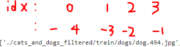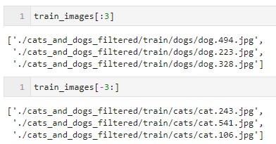 from glob import glob # * : 어떠한 값이든 들어올 수 있다 # ./cats_and_dogs_filtered/train/ 경로에 있는 모든 폴더(**)에 있는 g로 끝나는 파일들 모두 train_images = glob("./cats_and_dogs_filtered/train/**/*g") # ./cats_and_dogs_filtered/validation/ 경로에 있는 모든 폴더(**)에 있는 g로 끝나는 파일들 모두 valid_images = glob("./cats_and_dogs_filtered/validation/**/*g") #g로 끝나는 파일은 jpg, png 같은 이미지 파일만을 받아오기 위함이다. # Train / Validation 개수 확인 print(f"train len : {len(train_images)}, validation len : {len(valid_images)}") #=> train len : 2000, validation len : 1000./cats_and_dogs_filtered/train/ 경로있는 cats와 dogs 폴더로부터 경로&이름 정보를 가져온 것을 확인할수 있다.
