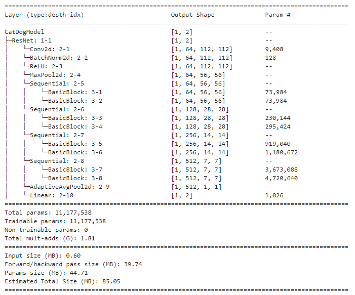 import torch from torchvision.models import resnet18 class CatDogModel(torch.nn.Module): def __init__(self): super().__init__() self.model = resnet18(weights=None, num_classes=len(set(train_labels))) # 순전파, 입력벡터(X)를 넣어서 예측 결과를 받는 매서드 def forward(self, x): return self.model(x) # 예측 결과를 받는 매서드 # argmax는 가장 높은 수를 1로 변환하고 나머지를 0으로 변환하는 기법 # [8,12,30] => [0,0,1] def predict(self, x): return torch.argmax(self.forward(x), dim=1) # 예측확률 결과를 받는 매서드 # softmax는 모든 수의 합을 1로 맞추는 기법 # [8,12,30] => [0.16,0.24,0.6] def predict_proba(self, x): return torch.softmax(self.forward(x), dim=1)from torchinfo import summary model = CatDogModel() # 모델 생성 summary(model, input_size=(1, 3, 224, 224)) # 모델 요약정보 생성