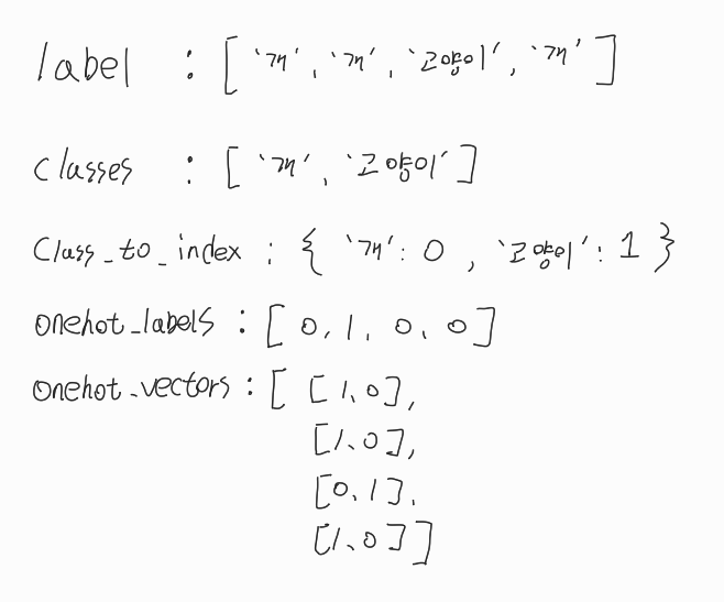 import torch from torch.utils.data import Dataset class ImageDataset(Dataset): def __init__(self, image_paths, labels, transform=None): self.image_paths = image_paths self.labels = labels self.transform = transform self.classes = sorted(set(labels)) self.class_to_index = {c: i for i, c in enumerate(self.classes)} self.onehot_labels = [self.class_to_index[label] for label in labels] self.onehot_vectors = torch.eye(len(self.classes))[self.onehot_labels] def __len__(self): return len(self.image_paths) def __getitem__(self, index): image = load_images([self.image_paths[index]])[0] if self.transform: image = self.transform(image) return image, self.onehot_vectors[index]이때 몇가지 필드의 값 예시를 들자면 아래와 같다.