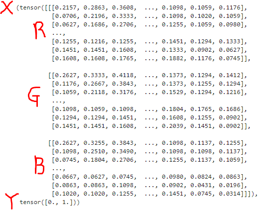 from torchvision import transforms train_data = ImageDataset(train_images, train_labels,transform=transforms.ToTensor()) train_data.__getitem__(0)0번째 이미지를 뽑아보면 RGB 형태의 벡터로 변환된 것을 확인할 수 있다.