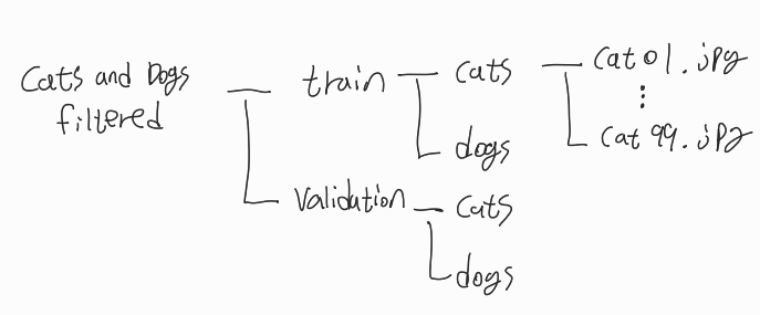 "cats and dogs filtered" 폴더 내부에서 "train", "validation" 폴더로 나누어진다.