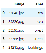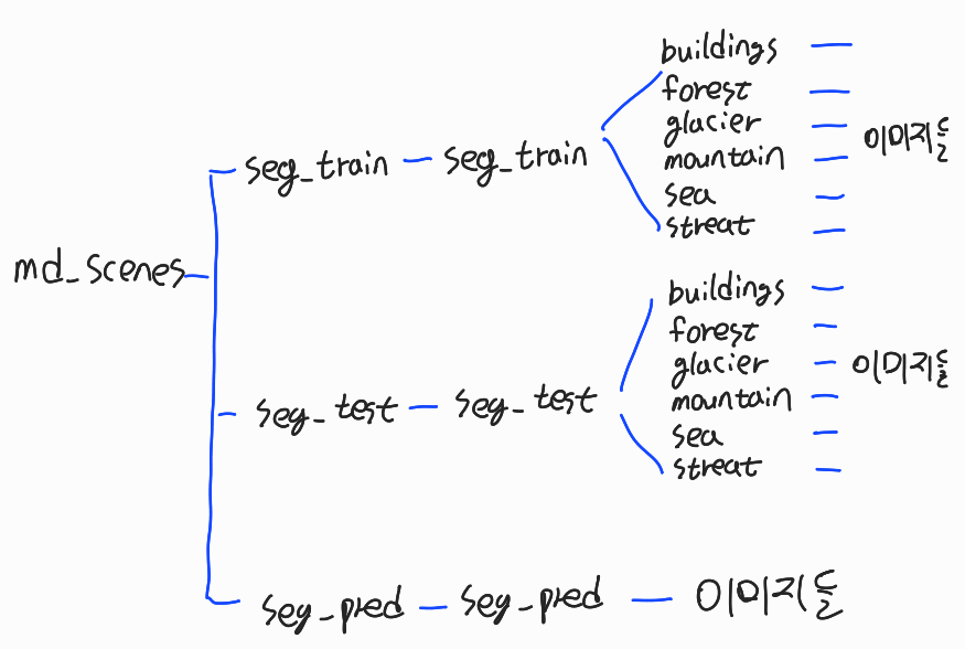 # from glob import glob # 사용할 Train, Valid, Test 이미지 경로 모두 파싱 train_images = glob("./md_scenes/seg_train/seg_train/**/*g") valid_images = glob("./md_scenes/seg_test/seg_test/**/*g") test_images = glob("./md_scenes/seg_pred/seg_pred/*g") print(train_images[0]) #=> ./md_scenes/seg_train/seg_train/forest/8554.jpg각 이미지들은 해당하는 라벨(class)의 이름을 가지는 폴더안에 저장되어 있다.