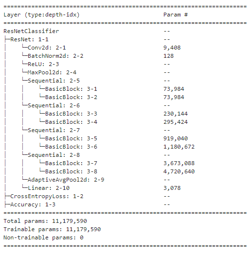 model = ResNetClassifier(6) # 6은 라벨의 개수모델의 구조를 보고싶다면 아래의 코드로 확인 가능하다.