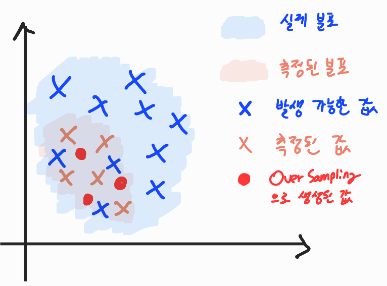 Over sampling은 소수 Class의 측정된 샘플들의 분포를 기반으로 새로운 값을 생성한다.