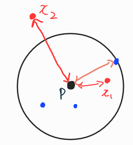 대상이 x2라면 x2와의 거리가 k-distance보다 길기에 d(p,x2)가 된다.