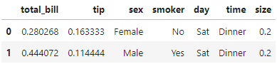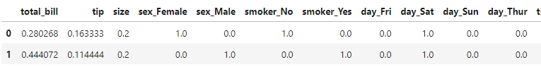 numeric_cols = ['total_bill','size'] # 수치형 데이터 categoric_cols = ['sex','smoker','day','time'] # 범주형 데이터 encoded_categoric_cols = [] # 범주형 데이터 인코딩 후 변경된 컬럼 저장용 target = ['tip'] # 예측하고자 하는 목표(y)2.4.2 스케일링(Scaling)