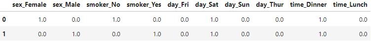 #from sklearn.preprocessing import OneHotEncoder enc = OneHotEncoder() enc.fit(train_df.loc[:,categoric_cols]) encoded_df = pd.DataFrame(enc.transform(train_df.loc[:,categoric_cols]).toarray(), columns=enc.get_feature_names(categoric_cols)) encoded_categoric_cols = list(encoded_df.columns) encoded_df.head(2)