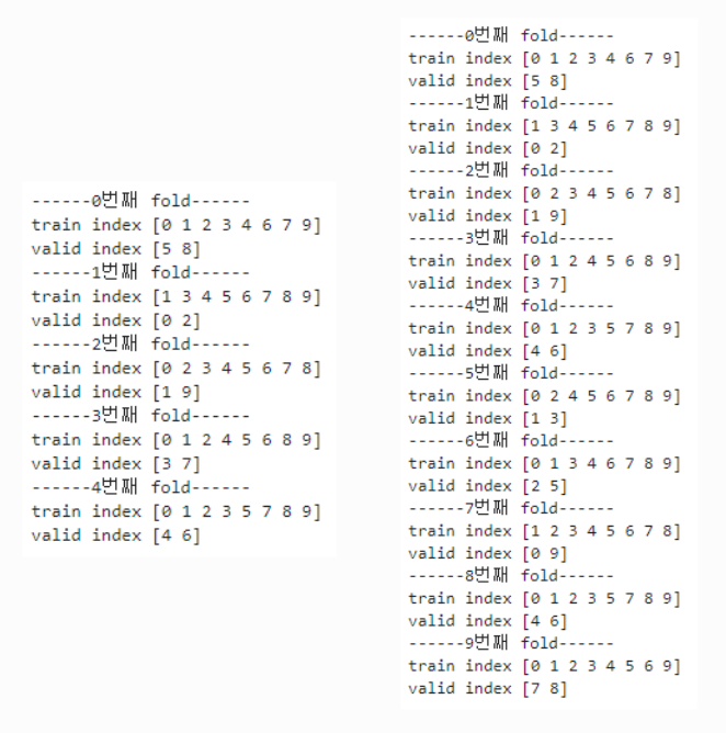 tmp_df = pd.DataFrame({ 'col_a' : [1,2,3,4,5,6,7,8,9,10] }) i=0 for train_index, valid_index in rkf.split(tmp_df.index): print(f'------{i}번째 fold------') print('train index',train_index) print('valid index',valid_index)