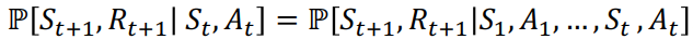 - P : transition kernel \( P(S_{t+1},R_{t+1} | S_{1},A_{1}, ... , S_{t},A_{t}) \)