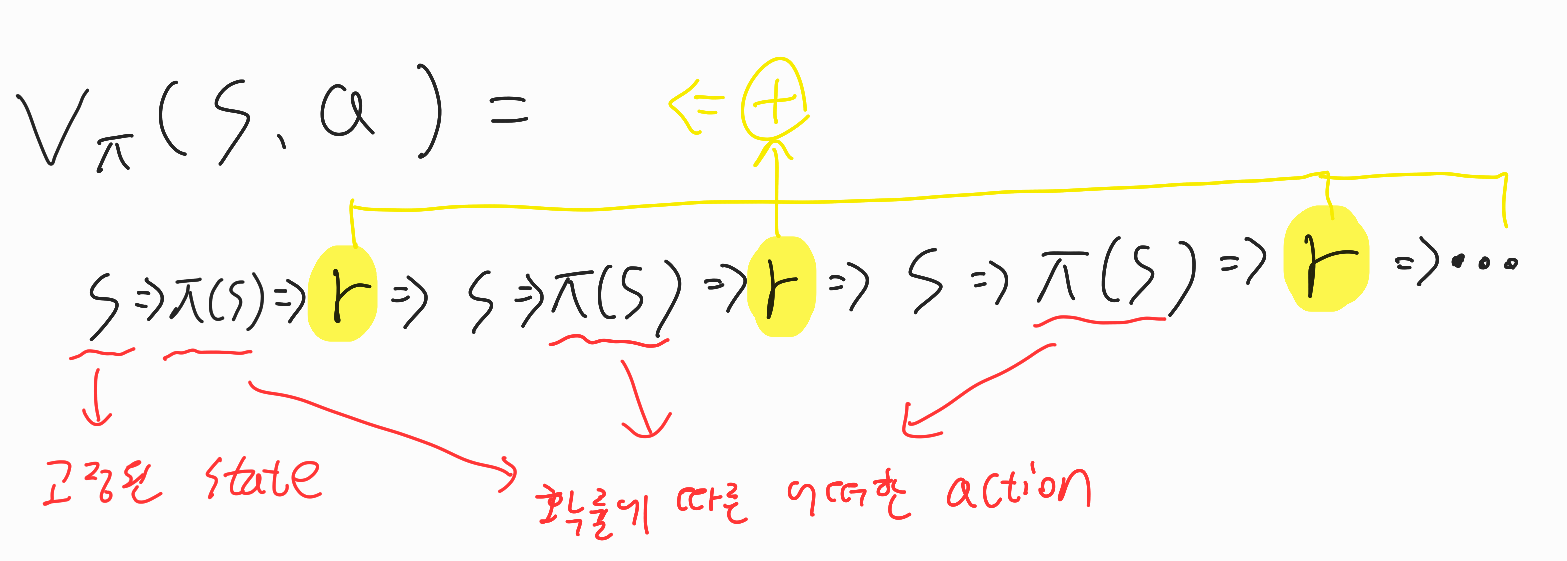 \( Q_{\pi}(s,a) > V_{\pi}(s,a) \) 일경우 state s에서는 \(\pi(s)\) 보다 특정 actoin a를 선택하는 것이 더 좋은 상황임을 의미한다.