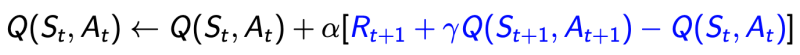 TD는 예측을 통해 얻은 \(R_{t+1}+\gamma Q(S_{t+1},A_{t+1})-Q(S_{t+1},A_{t+1})\) 값을 이용해 업데이트 한다.