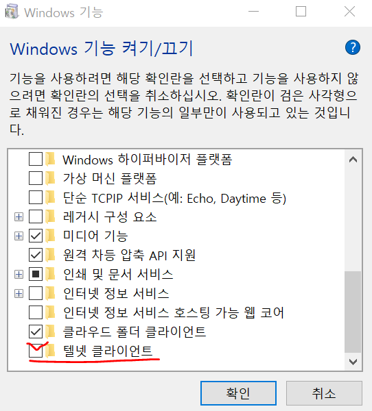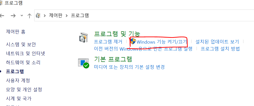 [제어판] > [프로그램 or 프로그램 추가/제거] > [프로그램 및 기능]>[window 기능 켜기/끄기]
