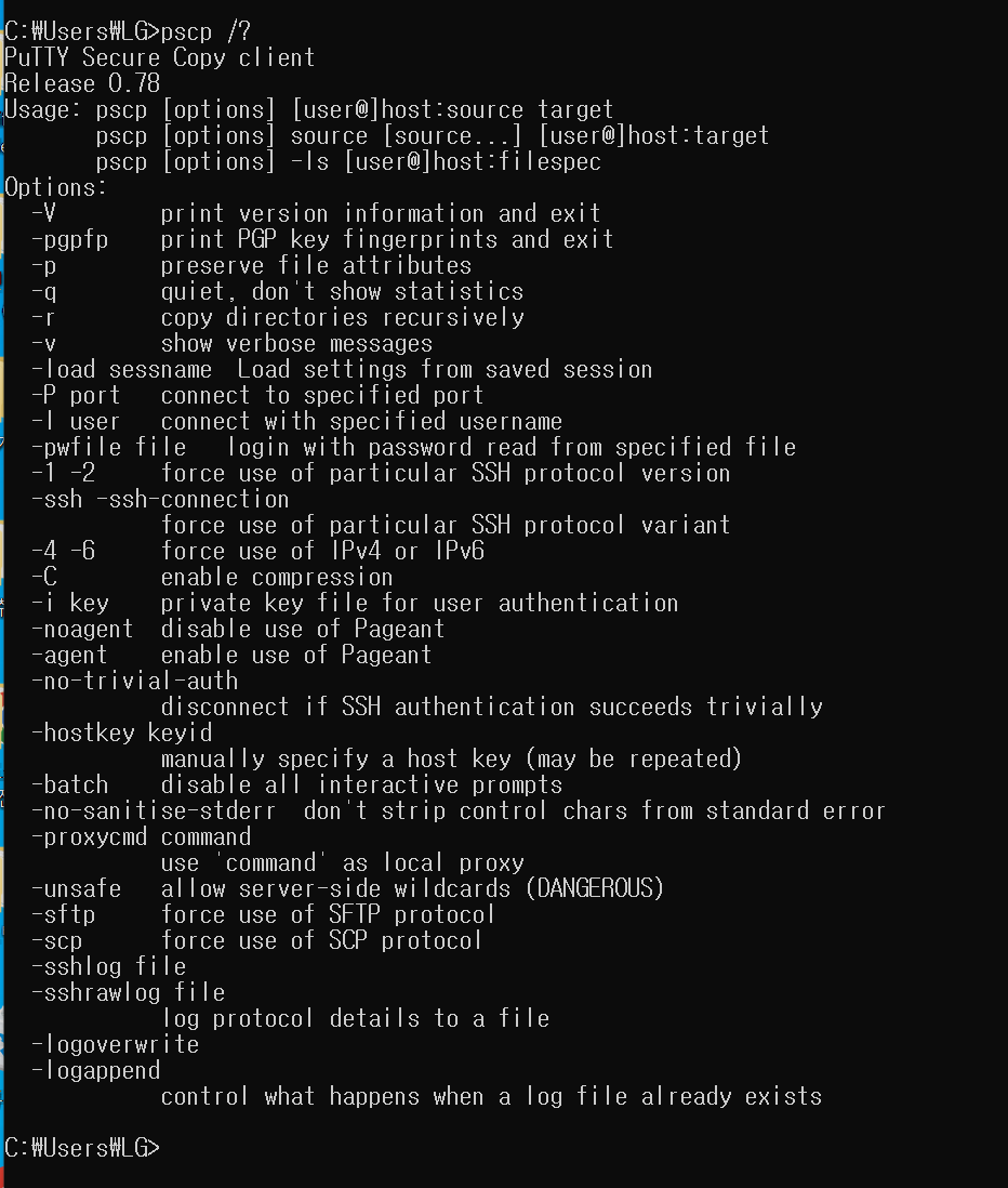 # 로컬PC to 원격PC # scp [옵션] [파일명] [원격PC id]@[원격PC ip]:[저장경로] scp testfile.txt root@111.111.111.111:/home/datafolder 현재 위치의 testfile.txt를 원격PC의 /home/datafolder에 복사 (하위 파일을 가지는 디텔토리 인경우 옵션 -r을 추가해야한다) # 원격PC to 로컬PC # scp [옵션] [원격PC id]@[원격PC ip]:[파일명] [저장경로] scp root@111.111.111.111:/home/datafolder/testfile.txt /local/data2. PSCP 사용방법(Window)