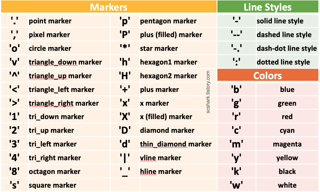 [마커모양], [선종류], [색]의 값들은 아래의 표에서 확인 할 수 있습니다.