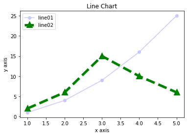 import matplotlib.pyplot as plt x_lst = [1,2,3,4,5] y_lst_1 = [1,4,9,16,25] y_lst_2 = [2,6,15,10,6] plt.plot(x_lst, y_lst_1, 'o-', color='#C8C8FF', label='line01') plt.plot(x_lst, y_lst_2, '^--g', linewidth=5, markeredgewidth=5, label='line02') plt.legend() plt.xlabel('x axis') plt.ylabel('y axis') plt.title('Line Chart') plt.show()