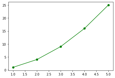 import matplotlib.pyplot as plt x_lst = [1,2,3,4,5] # x축좌표 y_lst = [1,4,9,16,25] # y축좌표 fmt = 'o-g' # [마커모양]+[선종류]+[색] plt.plot(x_lst, y_lst, fmt) plt.show()
