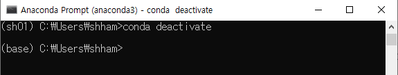 conda deactivate해당 명령어를 수행하면 좌측의 괄호 안의 이름이 {가상환경이름}에서 base로 돌아온 것을 볼 수 있다.