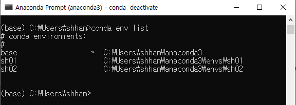 conda env list생성되어 있는 가상환경 리스트는 아래와 같이 나타난다.