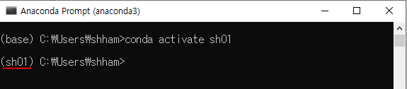 conda activate {가상환경이름}해당 명령어를 수행하면 좌측의 괄호 안의 이름이 base에서 {가상환경이름}으로 변경된 것을 볼 수 있다.