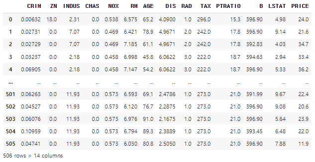 컬럼 설명 CRIM 타운 별 1인당 범죄율 ZN 25,000 피트 이상 주거용 토지 비율 INDUS 비소매 상업지역 점유 토지 비율 CHAS 강 인접 유무(1 = 강과 인접, 0 = 강과 인접하지 않음) NOX 산화질소 농도 RM 가구당 평균 방 수 AGE 1940년 이전 건축 주택 비율 DIS 5개 보스턴 직업센터 접근성 지수 RAD 방사형 도로 접근성 지수 TAX $10,000 당 재산세율 PTRATIO 도시별 학생/교사 비율 B 1000(Bk-0.63)^2 (Bk : 도시별 흑인 비율) LSTAT 모집단의 하위계층 비율(%) PRICES(Target) 본인 소유 주택가격(중앙값, 단위 : $1,000) 1. 파이썬에서 로드하기