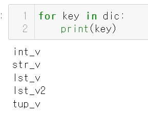 # 딕셔너리.keys() dic_keys_lst = dic.keys() print(dic_keys_lst) #>> dict_keys(['int_v', 'str_v', 'lst_v', 'lst_v2', 'tup_v']) print(list(dic_keys_lst)) #>> ['int_v', 'str_v', 'lst_v', 'lst_v2', 'tup_v']3.2 for문으로 key하나씩 받아오기