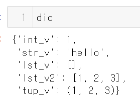 dic = { 'int_v' : 1, 'str_v' : 'hello', 'lst_v' : [], 'lst_v2' : [1,2,3], 'tup_v' : (1,2,3) }