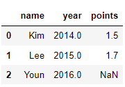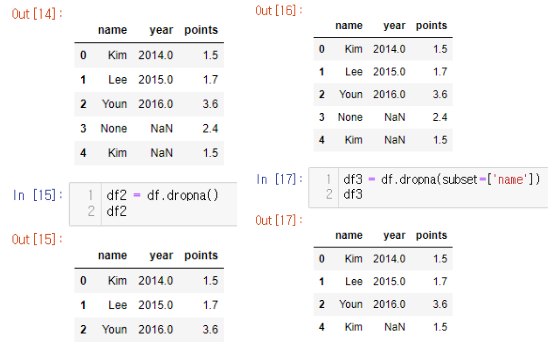 dic = { "name": ["Kim", "Lee", "Youn", "Kim"], "year": [2014, 2015, 2016, None], "points": [1.5, 1.7, None, None] } df = pd.DataFrame(dic) df3 = df.dropna(thresh=2) df3