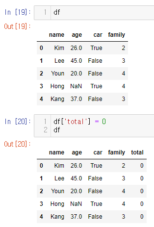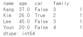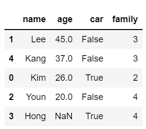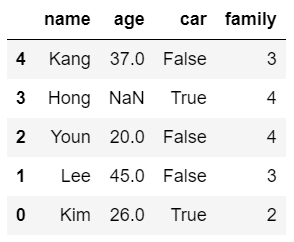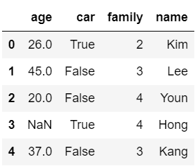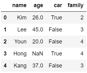 # 더미데이터 dic = { "name": ["Kim", "Lee", "Youn", "Hong", "Kang"], "age": [26, 45, 20, None, 37], "car": [True, False, False, True, False], "family": [2,3,4,4,3] } df = pd.DataFrame(dic)