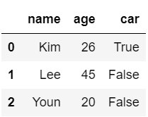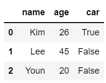 dic = { "name": ["Kim", "Lee", "Youn"], "age": [26, 45, 20], "car": [True, False, False] } df = pd.DataFrame(dic)